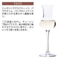 | エレガントでアロマティック、バラやタイム、バニラのニュアンスが感じられる柔らかく繊細な香り。 12℃前後に冷やし、チューリップ型のグラスで。数分間空気に触れさせてから口に含むと、よりいっそう香りを楽しめます。 |