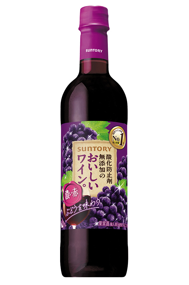| 酸化防止剤無添加のおいしいワイン。濃い赤は、幅広い料理に合わせやすい、ブドウの旨みがギュッとつまった赤ワインです。 厳選した高品質ブドウを使い、酸化防止剤無添加のワインに最適な酵母を選択するなどサントリー独自の発酵技術で、おいしいワインを実現しました。 ブドウを食べたときのようなブドウ本来の濃く豊かな味わいながら、後味はさわやか。やわらかでふくらみのある、やや甘口の飲みやすい赤ワインです。軽く冷やして飲むのがおすすめ。 |