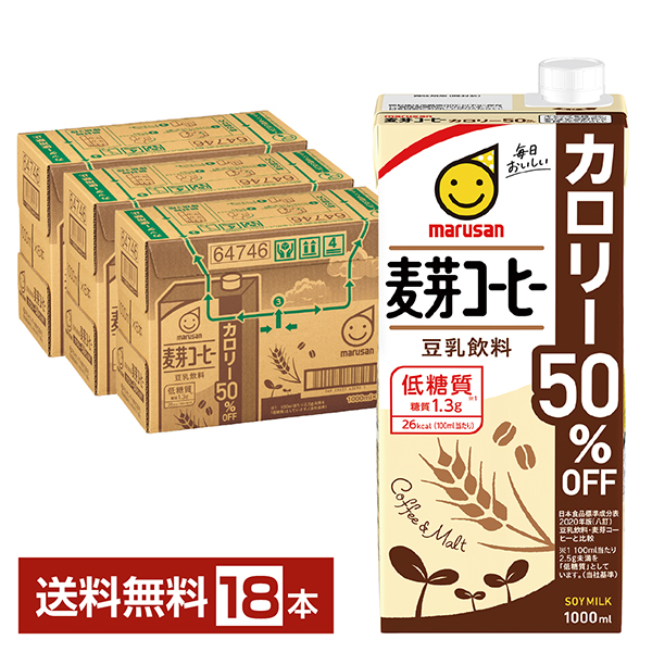 | マルサン 豆乳飲料 麦芽コーヒー カロリー50%オフは、ダイエット中でも気軽に飲みやすい、人気のシリーズ。 標準的な豆乳飲料 麦芽コーヒー(日本食品標準成分表2015年販(七訂))に比べ、カロリーを50%に抑えました。 すっきりとした飲み口で、毎日飲んでも飲み飽きない低糖質豆乳飲料。ラテ風味で食事時にも召し上がっていただけます。 炭水化物以外の栄養素はなるべくそのままで、美容を気にする方に飲んでいただきたい豆乳飲料です。 |