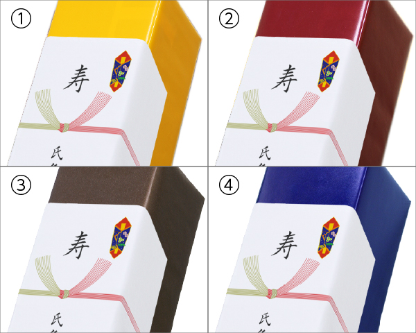 選べる4色のオリジナル包装紙 包装紙はイエロー、ワインレッド、ブラウン、ネイビーの4色からお選びいただけます。 包装紙は箱が透けない高級感ある紙質です。用途に合わせてのしの種類をお選びください。 (1)イエロー(艶あり) (2)ワインレッド(艶あり) (3)ブラウン(艶なし) (4)ネイビー(艶なし) |