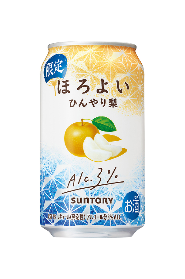 | アルコール度数3%でやさしい味わいの飲みやすいお酒として人気の高い、気軽・気楽に楽しめるサントリーの「ほろよい」シリーズ。 そんな「ほろよい」から人気の季節限定「ほろよい ひんやり梨」が登場。梨のすっきりとした甘さと酸味のバランスが取れたみずみずしい味わいに仕上げました。 パッケージは、涼し気な色合いの和柄を背景に描き、梨のイラストと、うちわを模した限定アイコンで涼やかさを表現しています。 お酒があまり強くない人も、お酒を飲み始めて間もない人も、無理せず自分のペースでお楽しみいただけます。 |