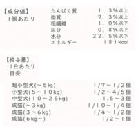 成分値タンパク質1.3%以上、脂質9.3%以上、粗繊維1.0%以下、灰分0.8%以下、水分22.5%以下、エネルギー181kcal