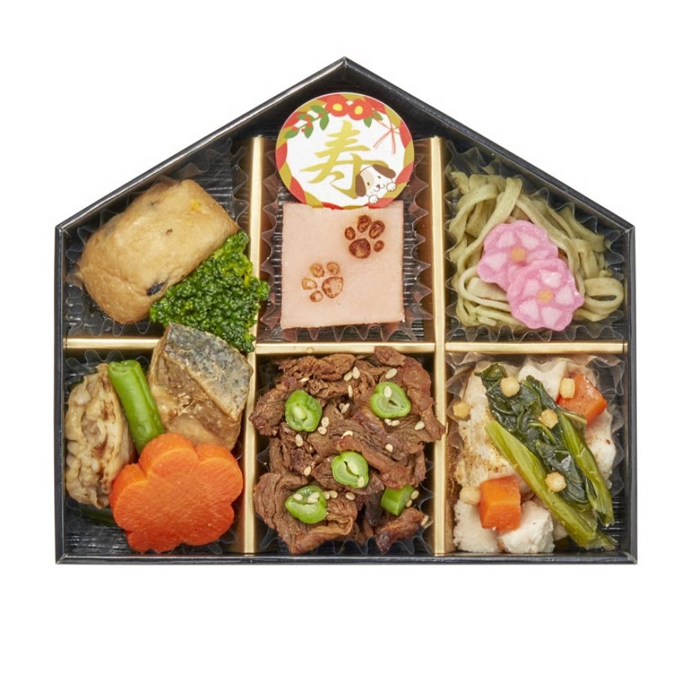 馬肉のしぐれ煮や、お正月の定番であるお雑煮をイメージした鶏肉のお雑煮風などのお肉料理に、ぶり照焼とベビー帆立の甘露煮などの魚料理、モロヘイヤうどんや肉球の焼き印がかわいいしんじょうなど、彩り豊かな具材を絵馬に見立てた五角形のお重に詰めました。オリジナルピックで見た目の楽しさをプラスしています。