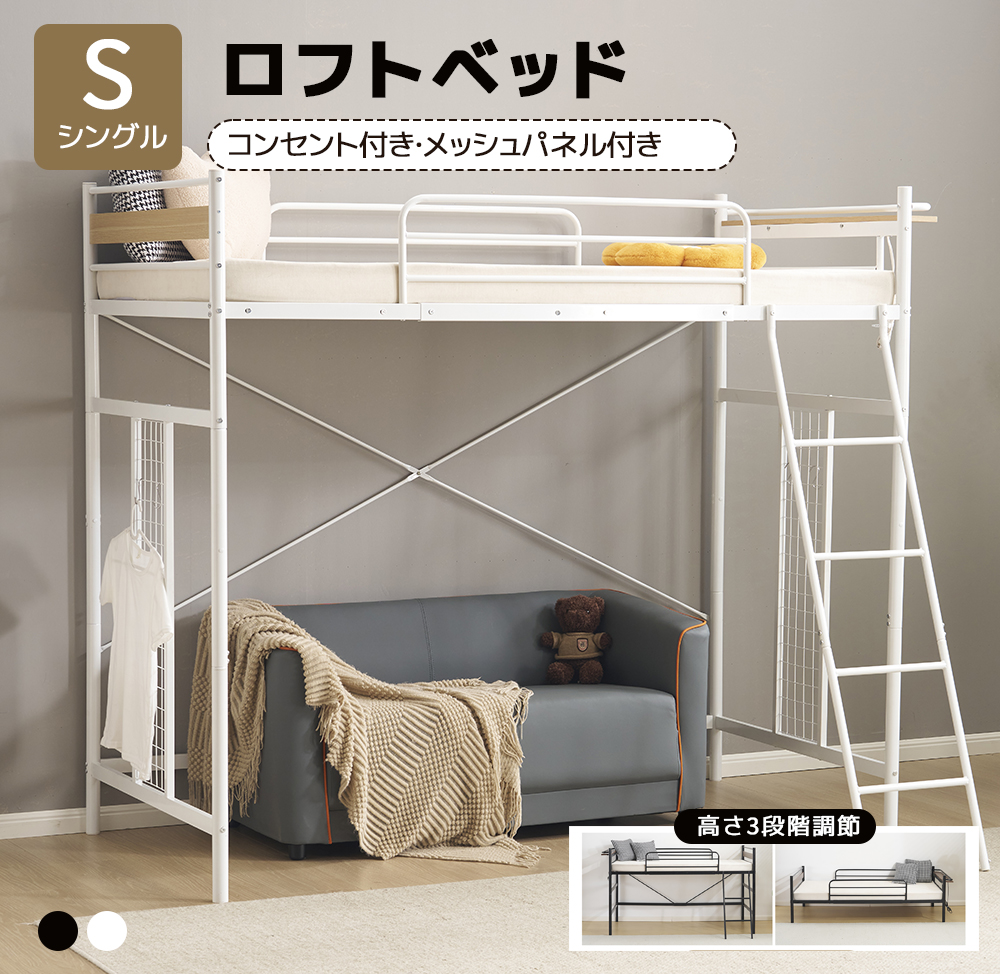 ロフトベッド シングル パイプベッド コンセント付き3WAYベッド メッシュパネル付 高さ3段階調節 子供ベッド 北欧風 スチール 耐震 一人暮らし ベッド