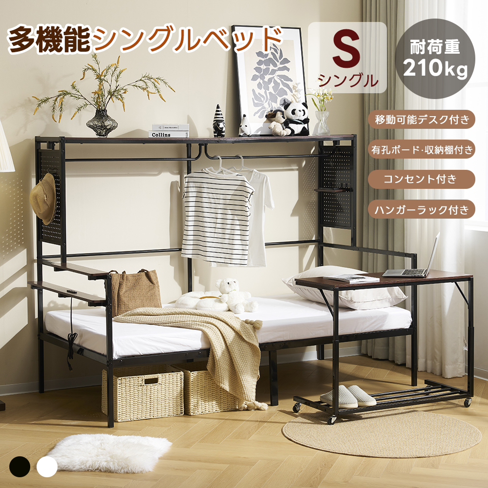 パイプベッド シングルベッド コンセント付き デスク付 収納棚付き ベッドフレーム 組立簡単 下収納 北欧 おしゃれ 耐荷重210kg 省スペース 一人暮らし