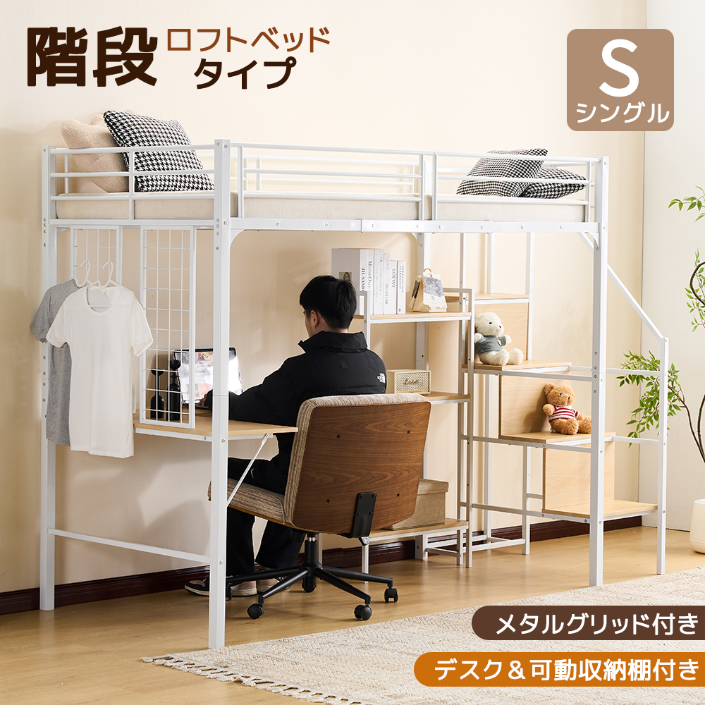 ロフトベッド シングル 収納棚付き デスク付き 階段付き 北欧風 子供ベッド 大人ベッド 一人暮らし スチール 耐震 ベッド