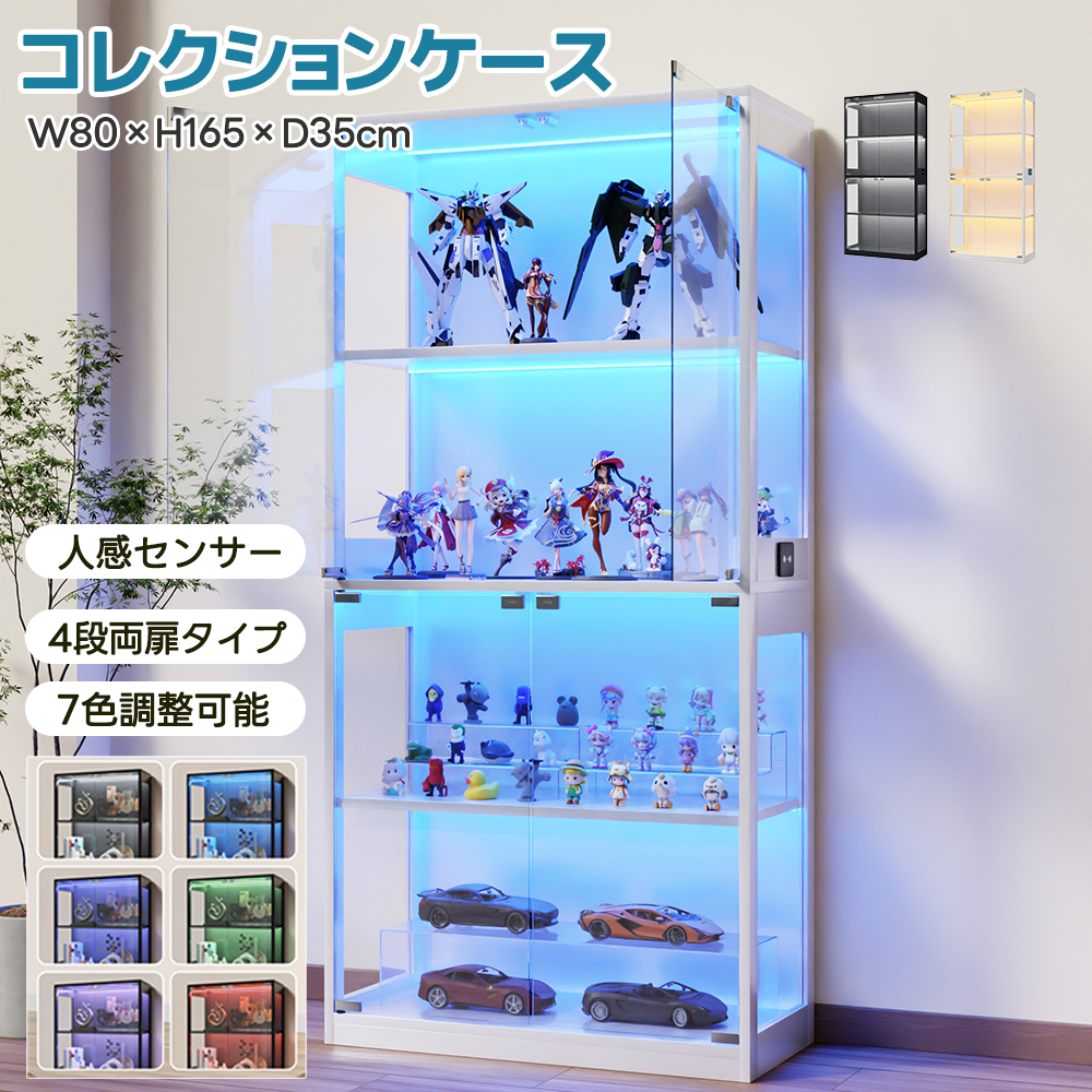 コレクションケース 4段 LEDライト付き ガラス ガラスケース 4段両扉タイプ スリム コレクションシェルフ ガラスディスプレイキャビネット 強化ガラス 飾り棚