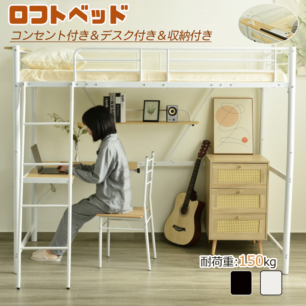 【全品5%OFFクーポン配布】ロフトベッド シングル 宮棚 耐震 頑丈 コンセント付き デスク付き 収納付き ラック棚付き システムベット パイプベッド 子供