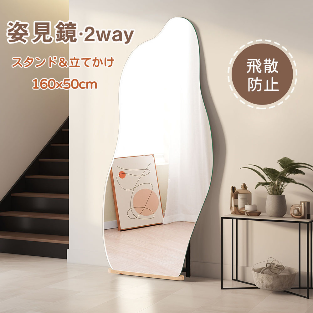 【160*50CM】全身鏡 姿見鏡 スタンドミラー ノンフレーム イレギュラミラー 立てかけ スタンド 姿見 鏡 ミラー おしゃれ 大型 飛散防止 木製台あり