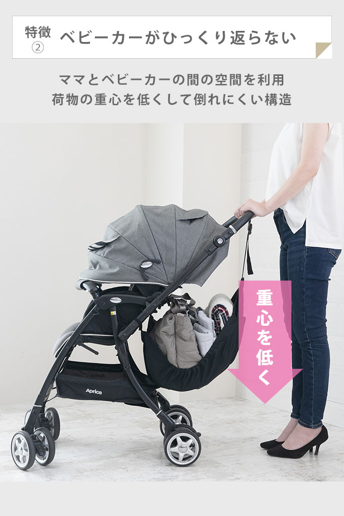 ママとベビーカーの間のスペースを利用しているから、荷物を載せてもベビーカーが倒れにくい。