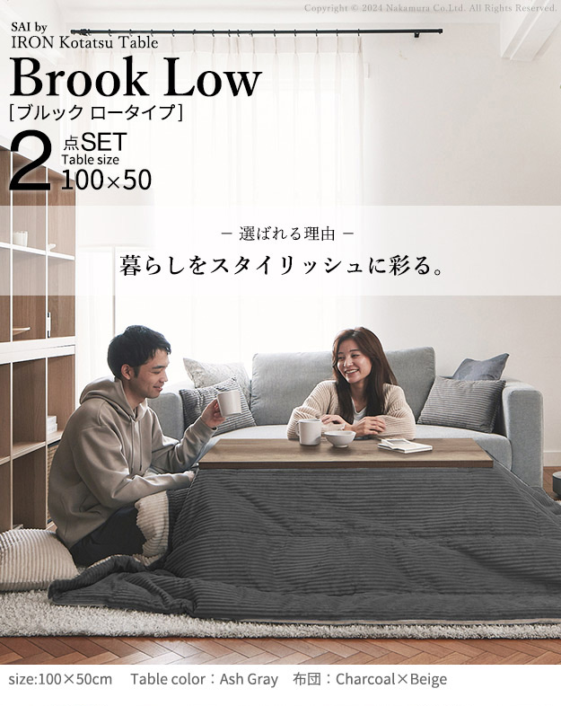 古材風アイアンこたつテーブル ブルック 100x50cm コーデュロイ布団 2点セット+コーデュロイ布団 2点セット