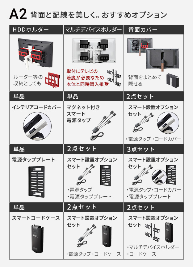 | [単品] >スマートコードケース | [2点セット] >電源タップ+コードケース | [2点セット] >マルチデバイスホルダー+コードケース |