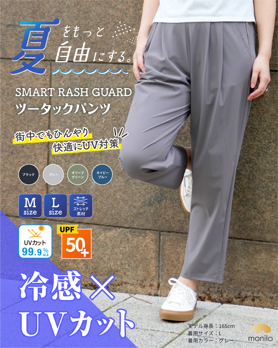ラッシュガード レディース ツータックパンツ 接触冷感 UVカット率99.9%以上 UPF50+ 洗濯可 体型カバー monilo