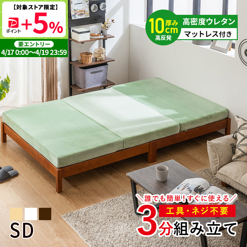 すのこベッド ベッド 工具不要 ネジ無し 簡単組み立て マットレス付 三つ折り高反発マットレス セミダブル パイン材 天然木