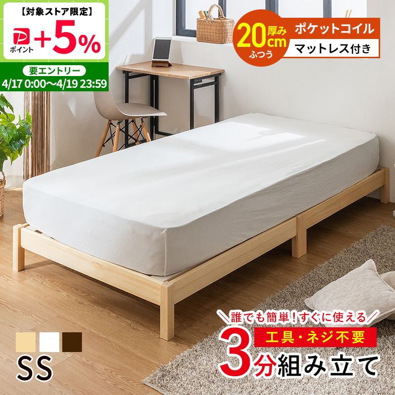 すのこベッド ベッド 工具不要 ネジ無し 簡単組み立て マットレス付 ポケットコイル セミシングル パイン材 天然木