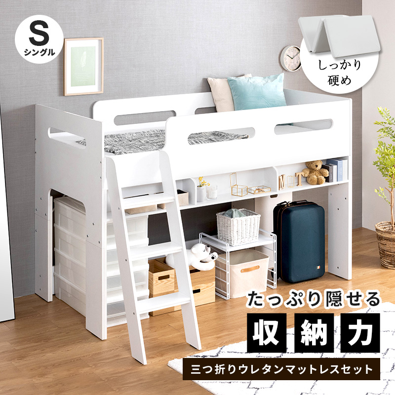 ロフトベッド ミドルベッド マットレスセット シングル シングルベッド 収納 ベッド下収納 木製 子供部屋 高反発 マットレス 3つ折り ウレタン