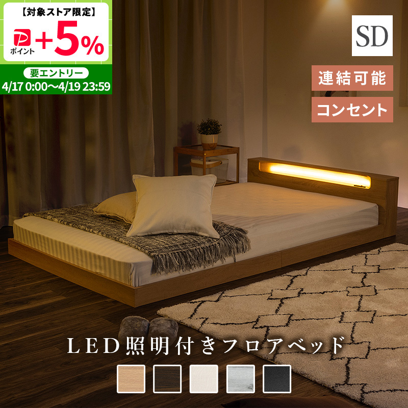フロアベッド ロータイプ ローベッド 連結 セミダブル ベッド すのこベッド LED ライト 連結可能 ベッドフレーム 照明 木製 コンセント 北欧風 ベット おしゃれ
