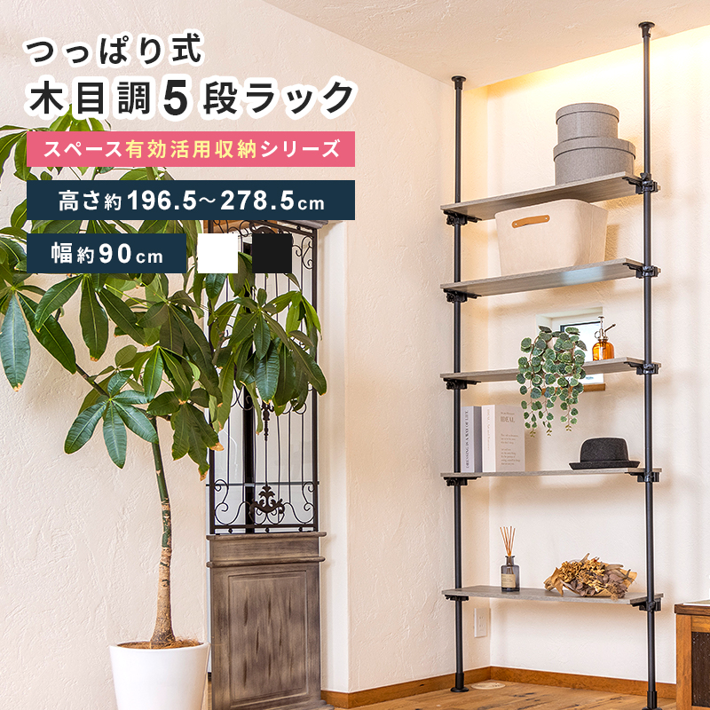 つっぱり オープンラック 棚 収納 ラック 5段 木製 90cm つっぱり棚 壁面収納 収納ラック つっぱり収納 収納棚 リビング デスク つっぱり棒 高さ調節 送料無料