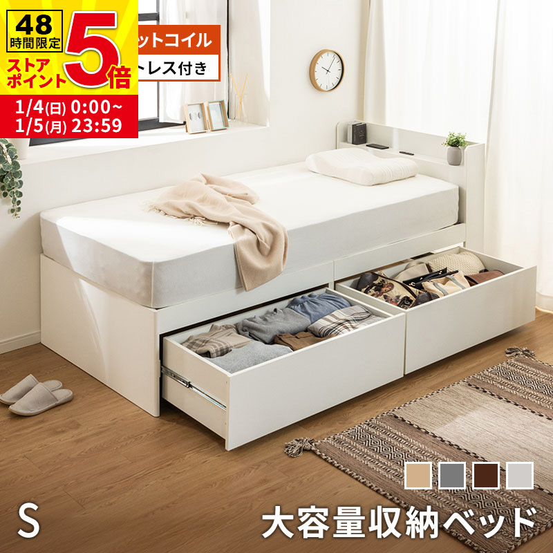 収納ベッド マットレス付き ポケットコイル ハイタイプ 収納付きベッド チェストベッド 大容量収納 容量約164L シングル コンセント付き