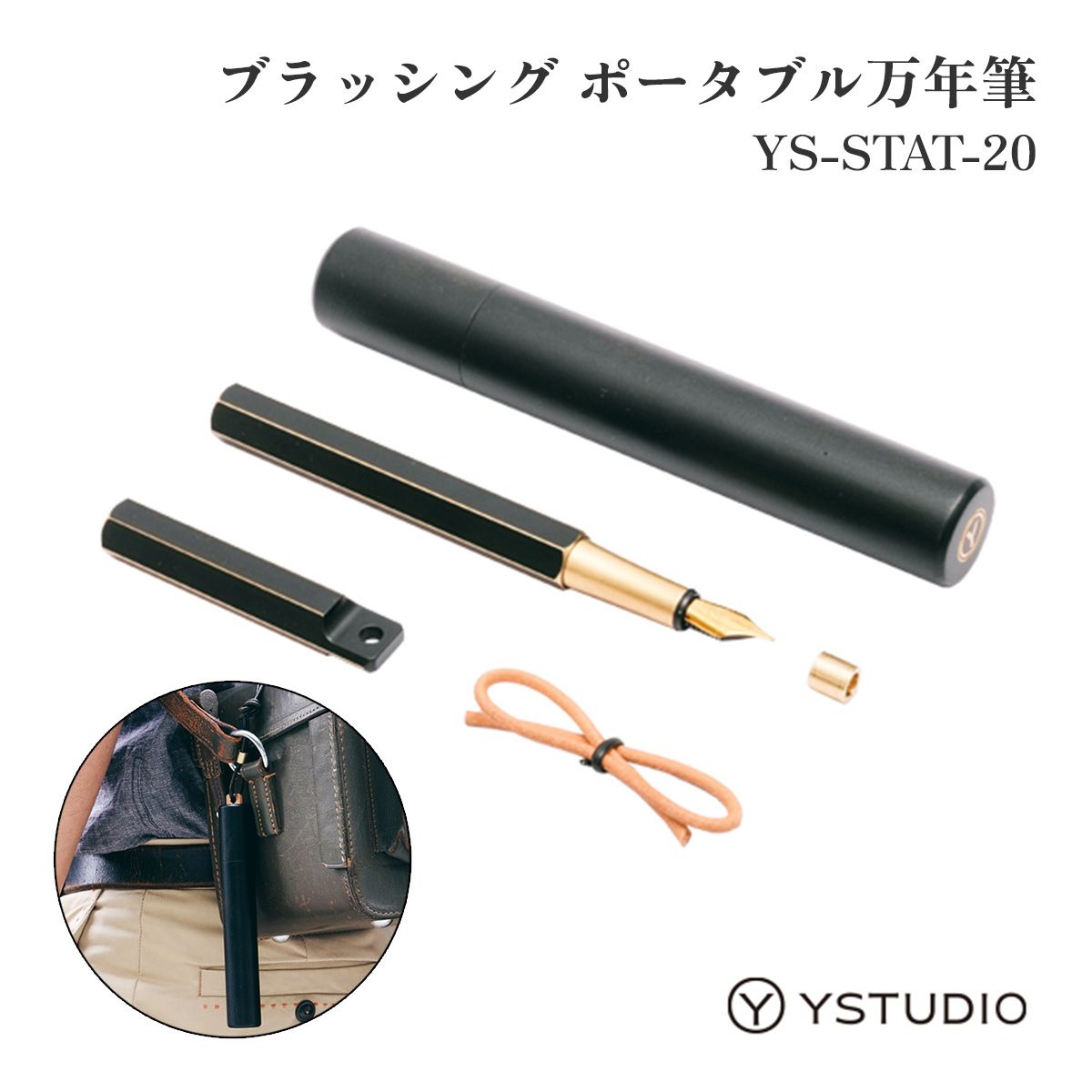 ystudio Brassing ポータブル万年筆(F) ブラック 真鍮製 筆記用具 ギフト用 軽量 旅行用 羊革 細字 台湾製 プレゼント 誕生日用