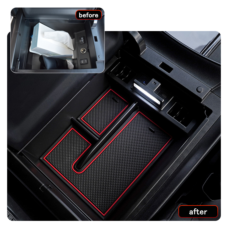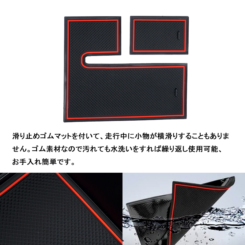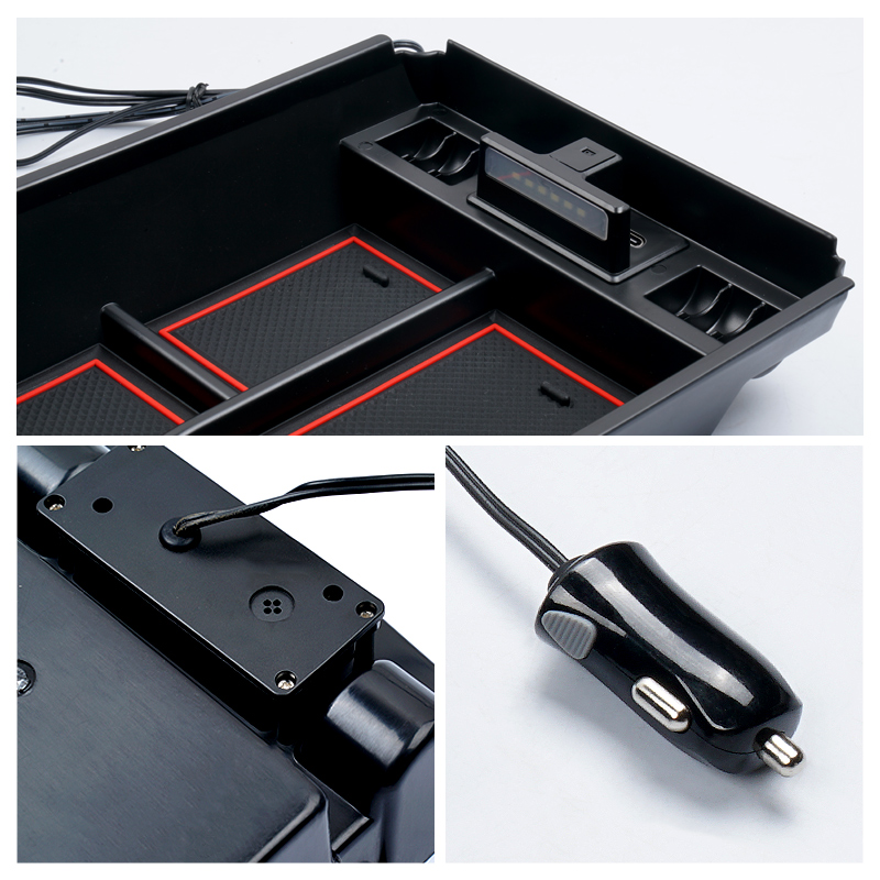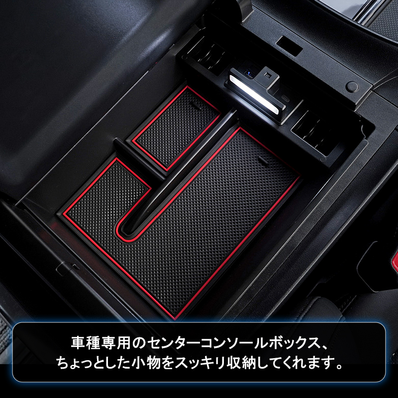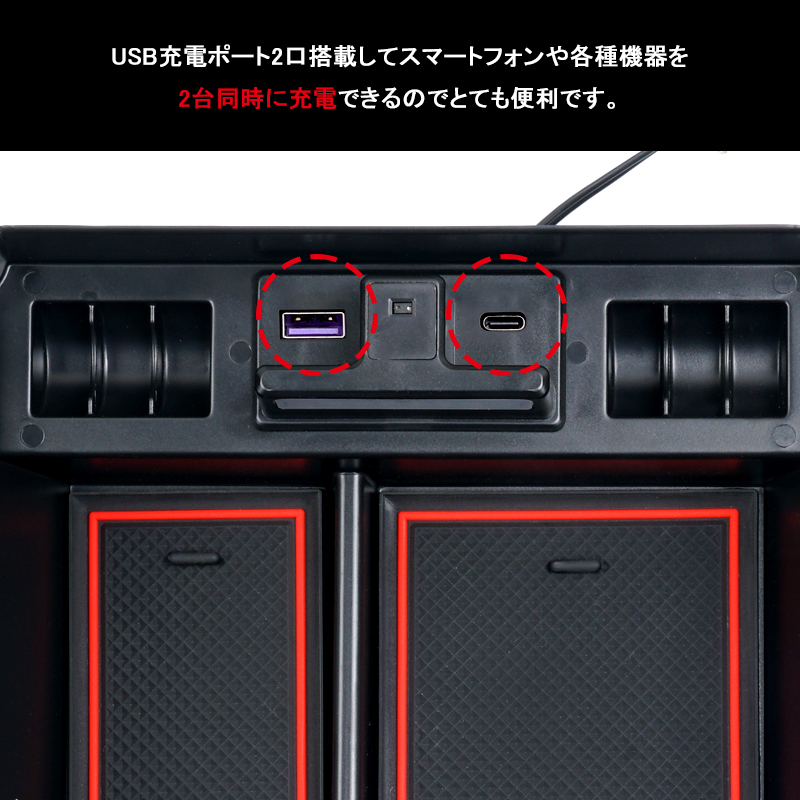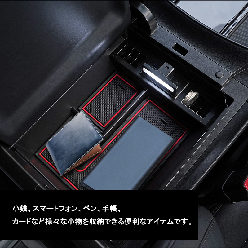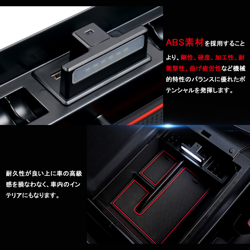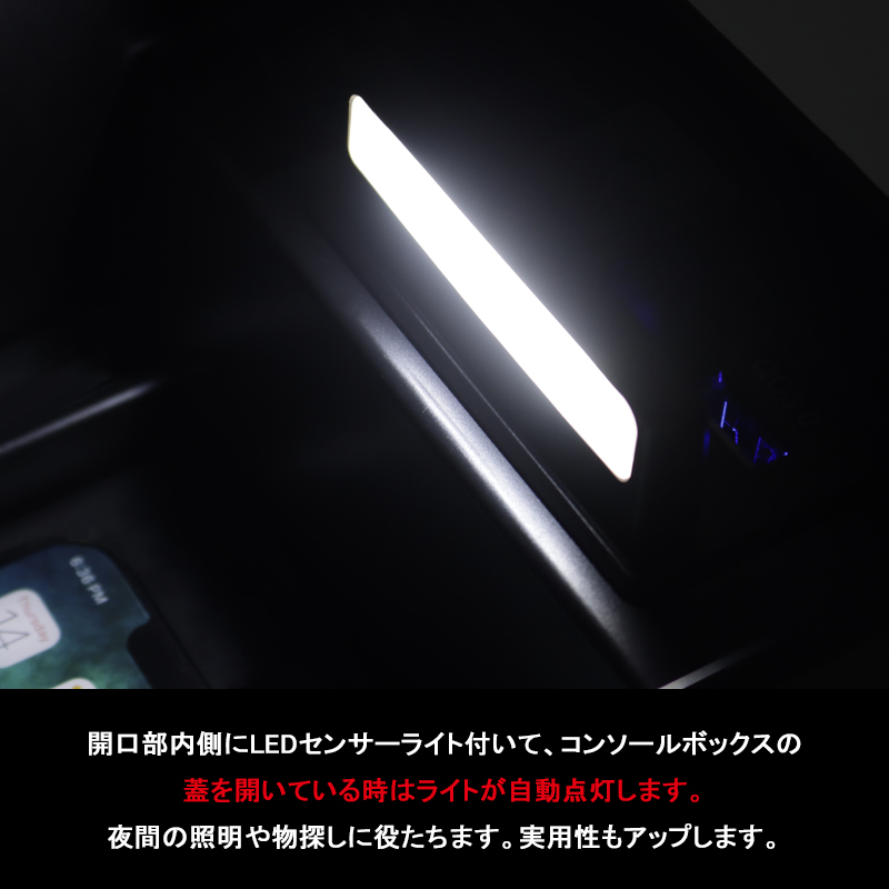 車種専用のセンターコンソールボックス、ちょっとした小物をスッキリ収納してくれます。USB充電ポート2口搭載してスマートフォンや各種機器を2台同時に充電できるのでとても便利です。開口部内側にLEDセンサーライト付いて、コンソールボックスの蓋を開いている時はライトが自動点灯します。夜間の照明や物探しに役たちます。実用性もアップします。ABS素材を採用することより、剛性、硬度、加工性、耐衝撃性、曲げ疲労性など機械的特性のバランスに優れたポテンシャルを発揮します。耐久性が良い上に車の高級感を損なわなく、車内のインテリアにもなります。小銭、スマートフォン、ペン、手帳、カードなど様々な小物を収納できる便利なアイテムです。滑り止めゴムマットを付いて、走行中に小物が横滑りすることもありません。ゴム素材なので汚れても水洗いをすれば繰り返し使用可能、お手入れ簡単です。コンソールボックスの上で載せるだけの簡単取付!