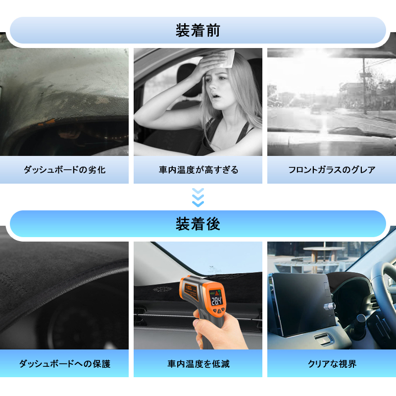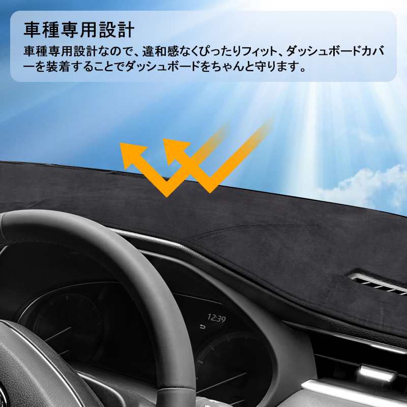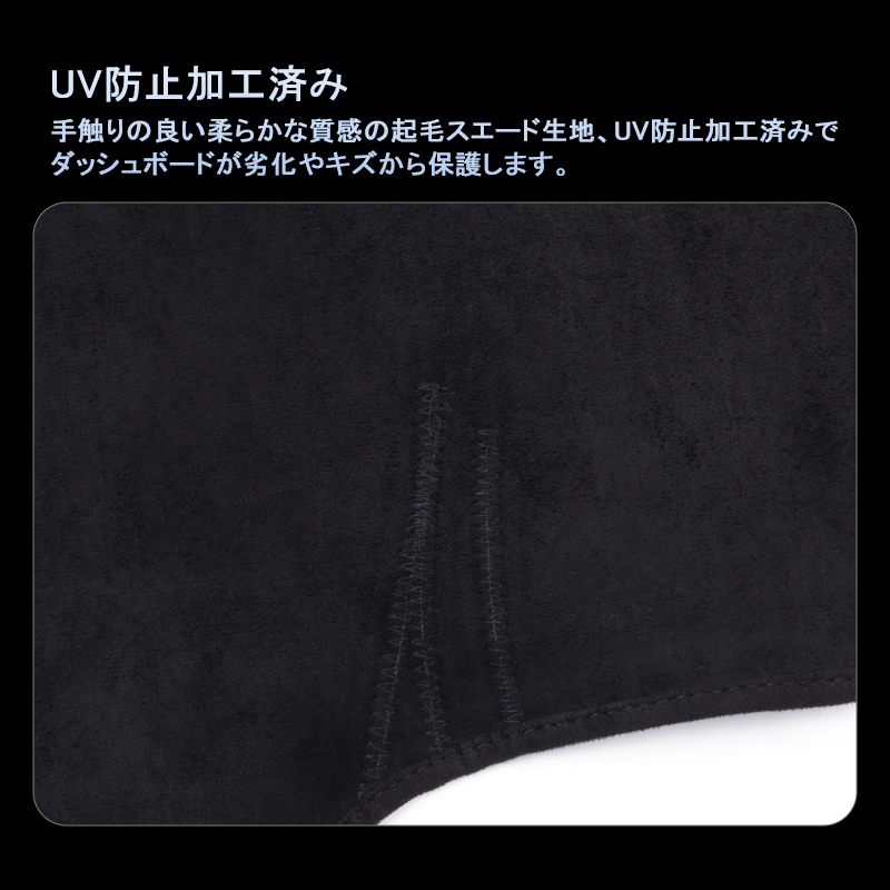 車種専用設計車種専用設計なので、違和感なくぴったりフィット、ダッシュボードカバーを装着することでダッシュボードをちゃんと守ります。UV防止加工済み手触りの良い柔らかな質感の起毛スエード生地、UV防止加工済みでダッシュボードが劣化やキズから保護します。映り込み防止ダッシュボードマットがフロントガラスへの映り込みを大幅軽減し、運転による疲労感を和らげます。クリアな視界でストレスの少ないドライブを体感頂けます。断熱効果直射日光にさらされるダッシュボード高温化を抑え、車内温度を低減します。ダッシュマットの完全な保護機能はダッシュボードを完璧な状態に保ちます。