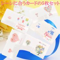 メッセージカードのイラスト面は光沢加工がされています。メッセージは誕生日(HAPPY BIRTHDAY)バレンタイン(Be my Valentine)お祝い(Best Wishes)と(BABY Show)の予め印刷された4種類とハートデザインのフリーメッセージカード1種類の合計5種類がラッピング袋とセットになっています。