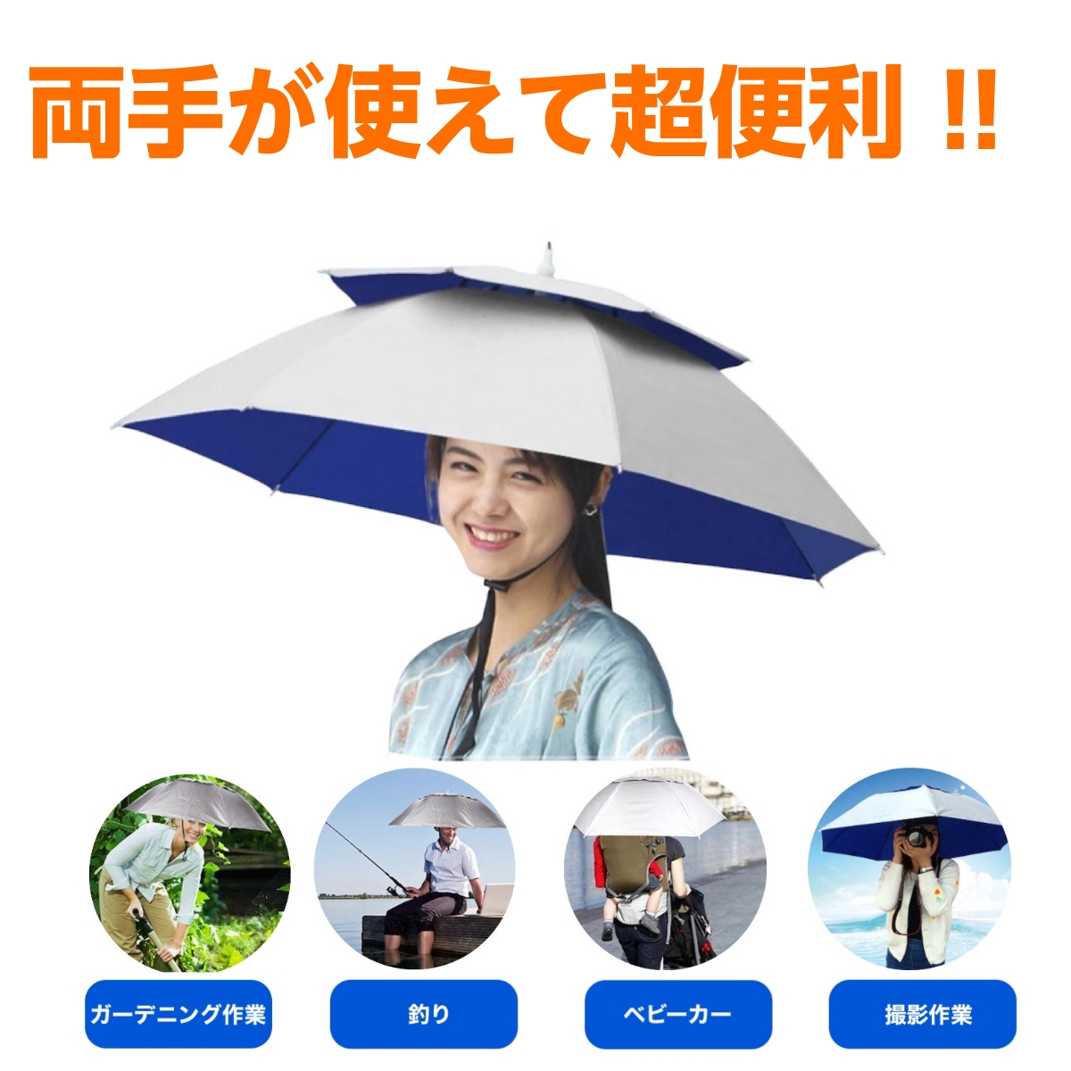 | 商品の説明 | ★【SLOWHAND】両手が使える 釣り傘 日傘 帽子傘 釣り ガーデニング 撮影 屋外作業に最適! ・ アルミで被覆された紫外線反射率の高いシルバーカラーが、貴方を真夏の太陽や、突然の雨から守ります。 ・装着がとても簡単! なおかつ軽量 コンパクト、バッグにに入れて持ち歩きできます。 ・サイズ: 使用時直径 使用時直径 95cm 折り畳み時長さ:34cm 重量:310グラム ・釣り 農作業 庭の草引き カメラ撮影 郵便配達 など、両手を使う作業には、一度使うと手放せません。 ・しまうときは傘の上部のボタン フック部分を押すだけでワンタッチに折りたたむことが出来ます。 ・日傘としてだけでなく 雨傘 雨の日の作業用 ガーデニング 農作業等にも とっても便利です。 【使用方法】 (1)傘の上部にある紐をカチッというまで引き出すと傘が開きます。 (2)ヘッドバンドをかぶり、アジャスターで顎にしっかりと固定します。 上記のツーステップで簡単に装着できます。 |