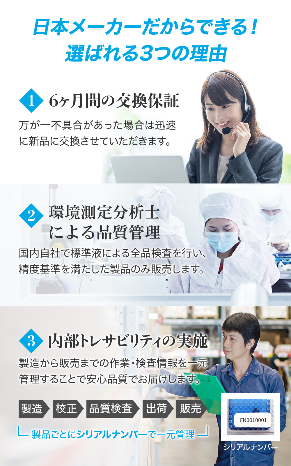 ・付属の校正剤から校正用標準液を作成する際に精製水(各250ml)が必要になります。