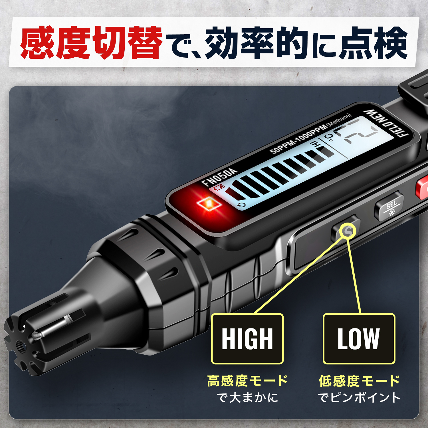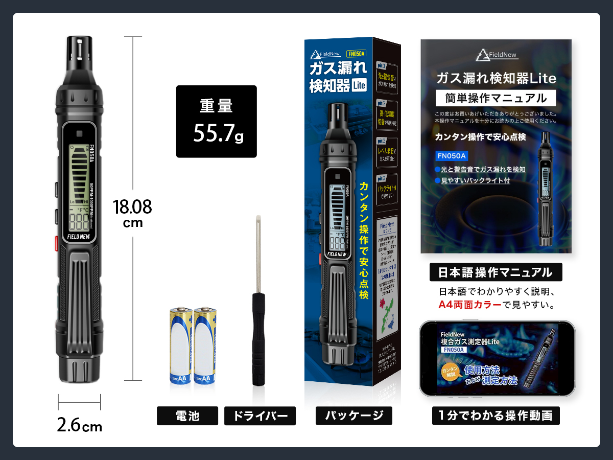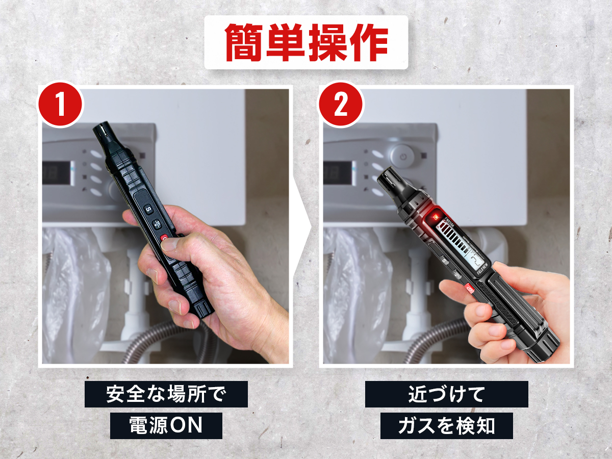 電源ボタンを押すだけのシンプル操作で、初心者の方にもやさしい設計です。高・低感度の切り替えも可能で、ガス漏れの程度や場所に応じて細かくチェックできるので日常使いにぴったりです。電源は単4形乾電池2本付属でコンセント不要。