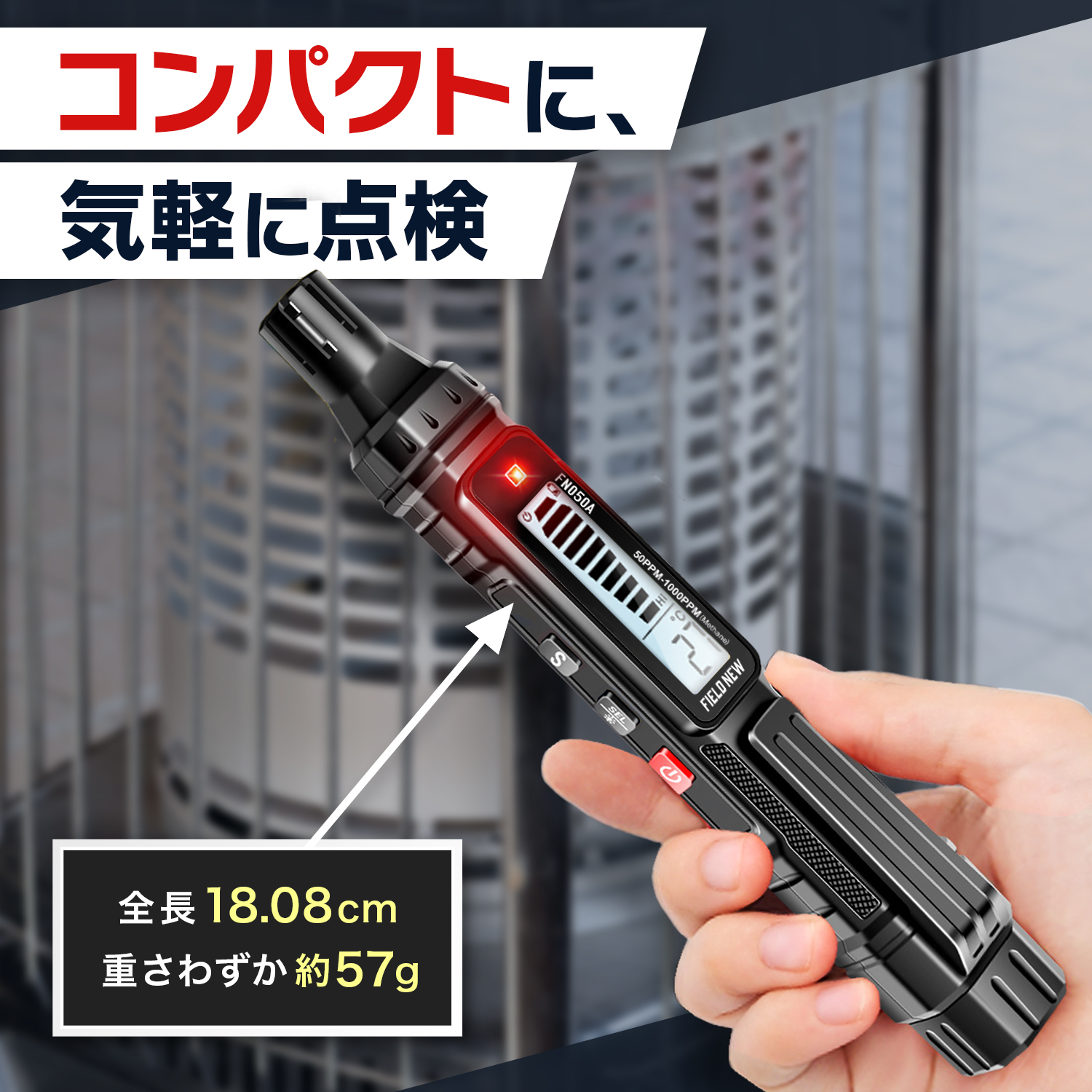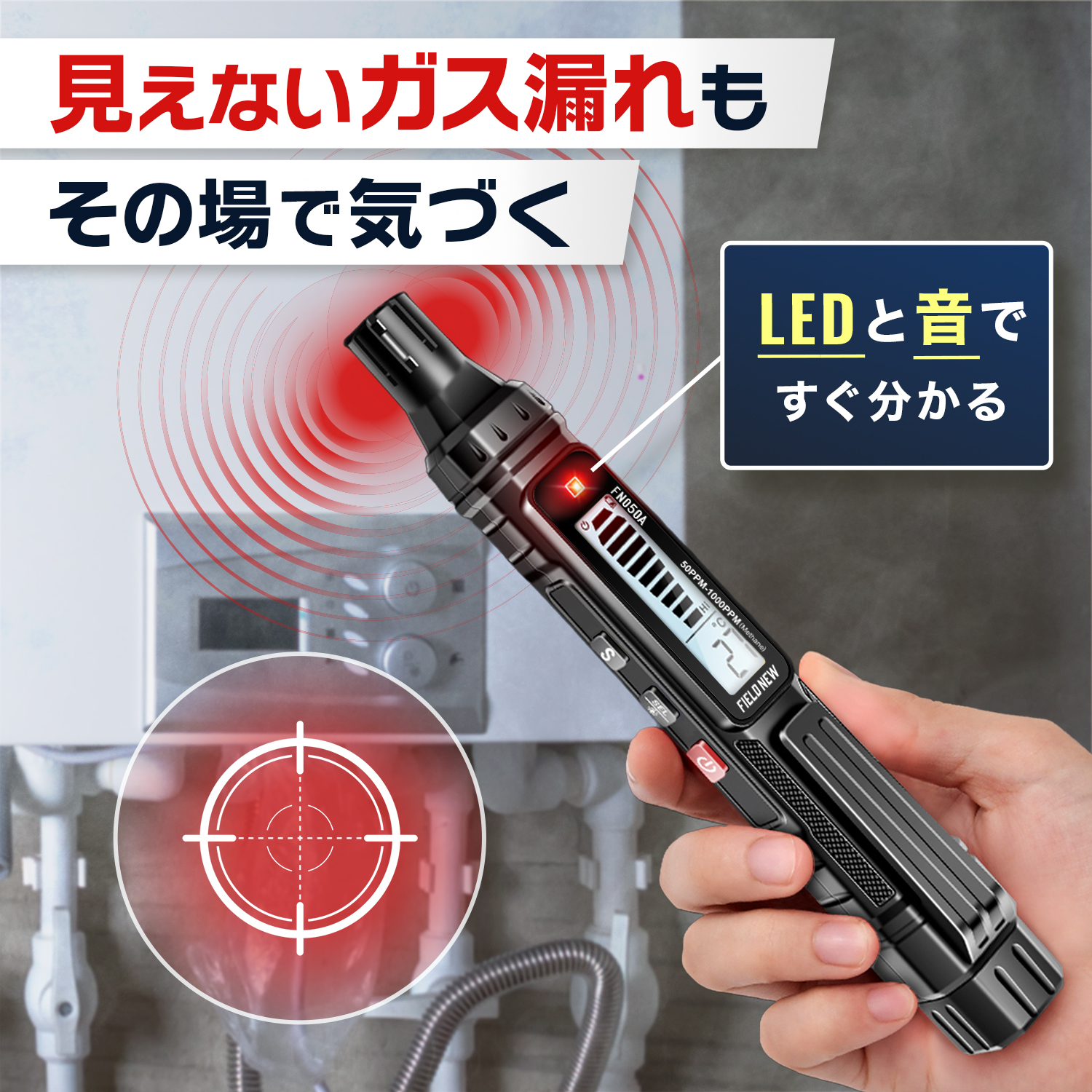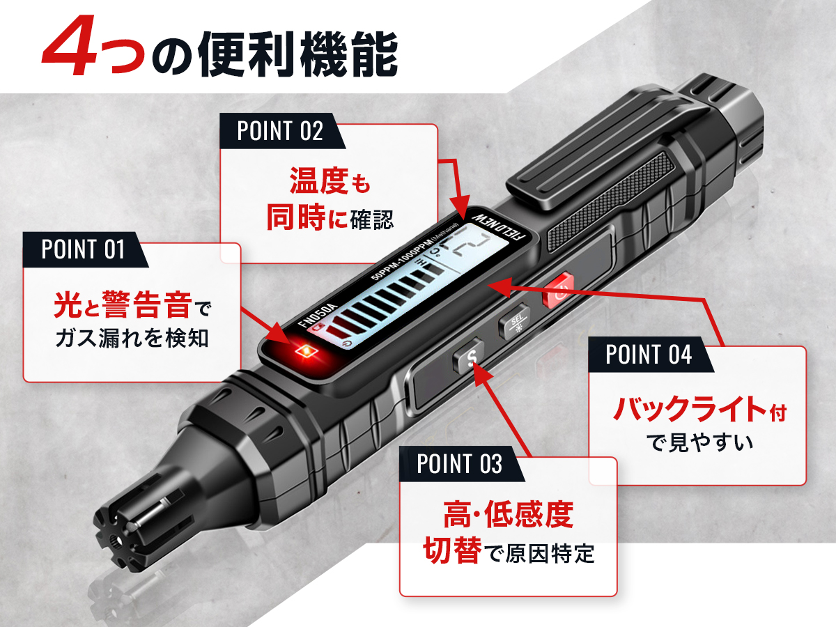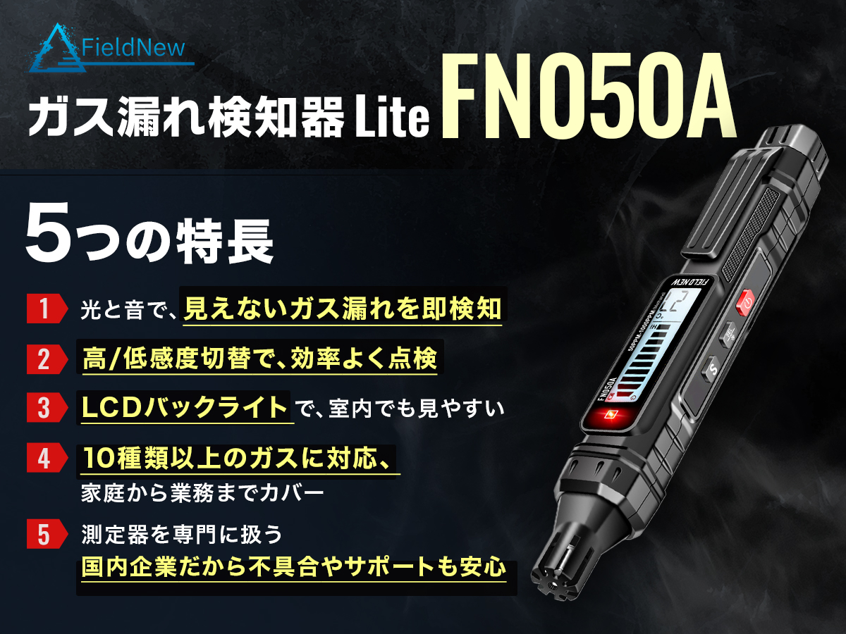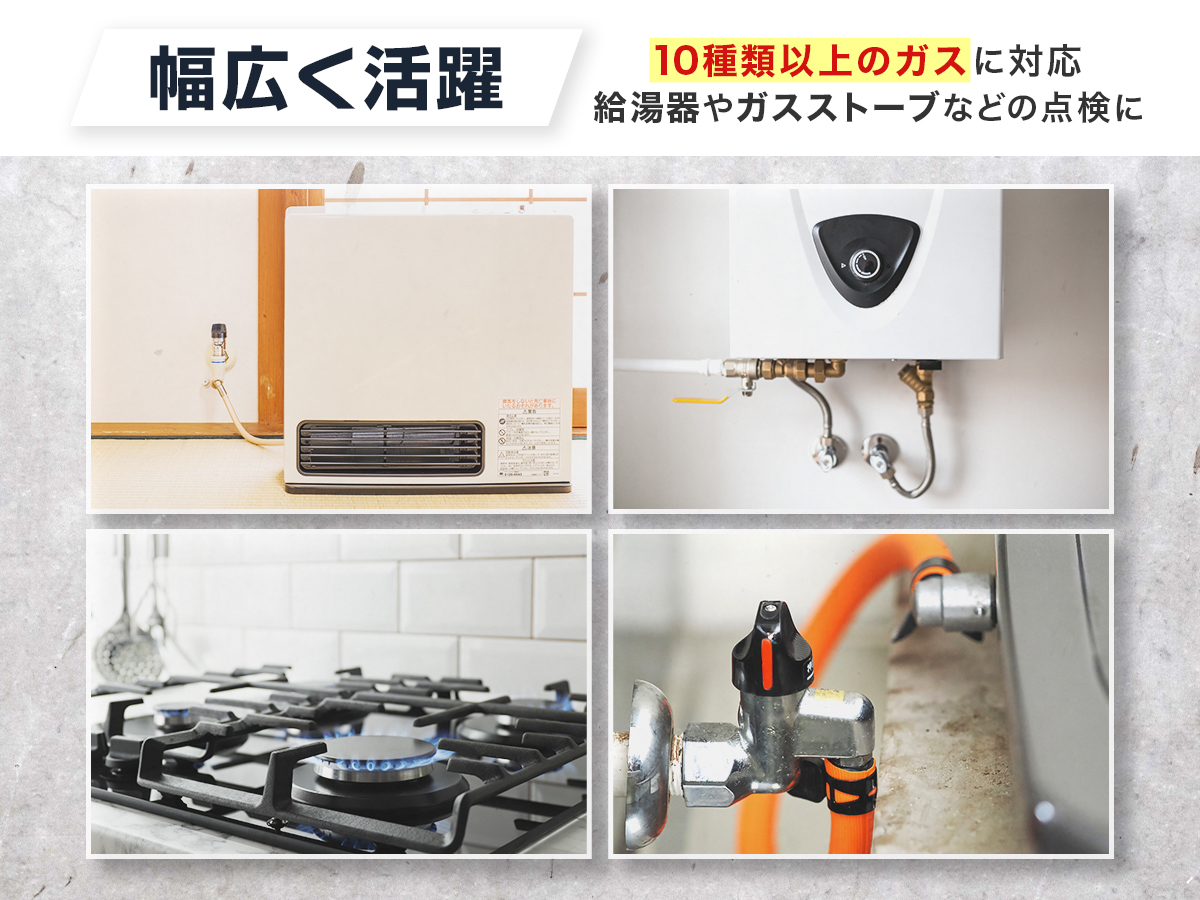 都市ガス(メタン)やプロパン、灯油など様々な可燃性ガスに対応。ガスコンロや給湯器、ストーブまわりでニオイが気になる時にサッと点検。家庭内の火気周辺での安全確認にぴったりです。