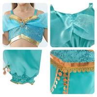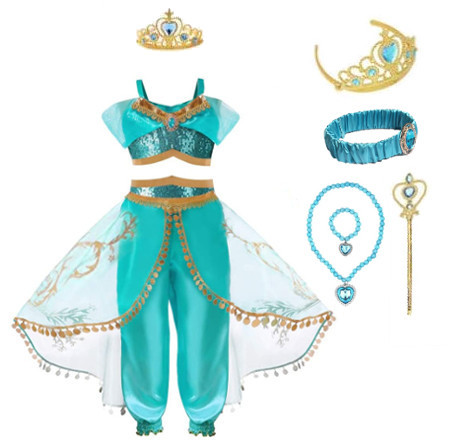 ジャスミン ドレス 子供 コスプレ 衣装 豪華7点 セット ( プリンセス ドレス上下,ヘアバンド,ティアラ,ネックレス,ブレスレット,ステッキ) 100 110 120 130 140