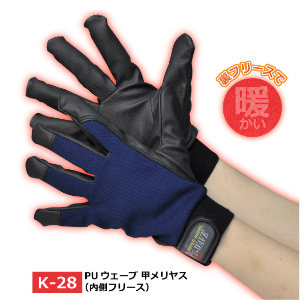 即日発送可 作業用手袋 防寒手袋 メンズ M-LLサイズ おたふく手袋 K-28 PU-WAVE 甲メリヤス ネイビー 建築 土木 DIY 寒さ対策 在庫限り メール便対応