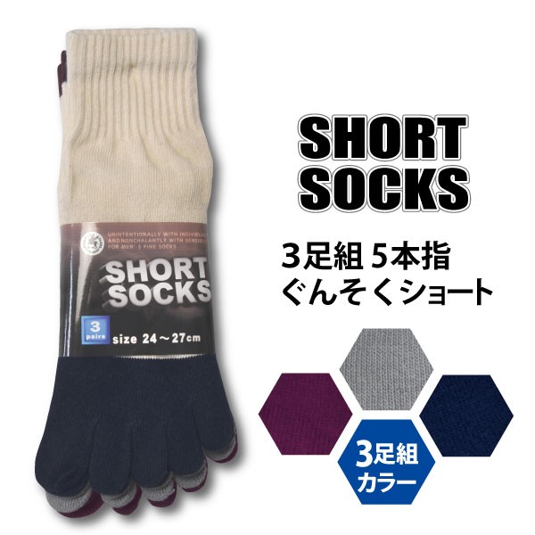 富士手袋工業 235 ぐんそくショート 五本指 3足組 カラー スニーカーソックス メンズ 24.0-27.0cm 紳士 新生活 作業靴下 メール便対応