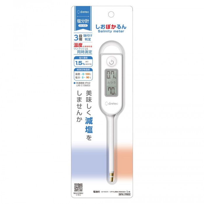 | 仕様 | 測定方式(塩分計):電気伝導度測定方式 被測定物温度(塩分計):0?90度 測定範囲:塩分計(0.3?1.5%)、温度計(-5?100度) 測定精度:塩分計(被測定物温度5?80度:±0.2%、その他の範囲:±0.4%) 温度計(±1度) 最小表示:塩分計(0.1%)、温度計(1度) 動作保証温湿度範囲:0?40度、85%RH以下(結露なきこと) 検針部耐熱温度:115度 防水仕様:JIS C0920 IPX2オートパワーオフ:約1分 使用電池:リチウム電池 CR2032×1個 電池寿命:約1年(1日6回使用の場合) 保障:1円環 |