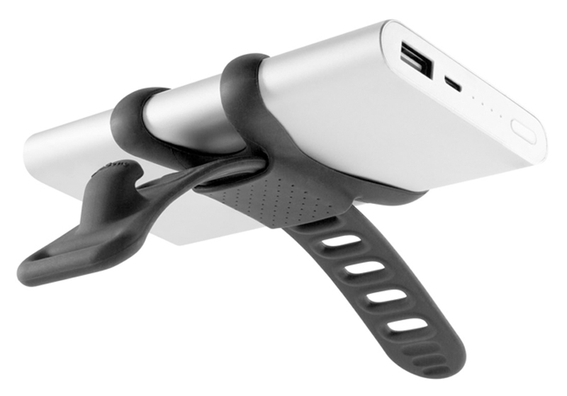 ・モバイルバッテリーをXバンドに通して固定し付属のバンドでステムやハンドルに固定します。