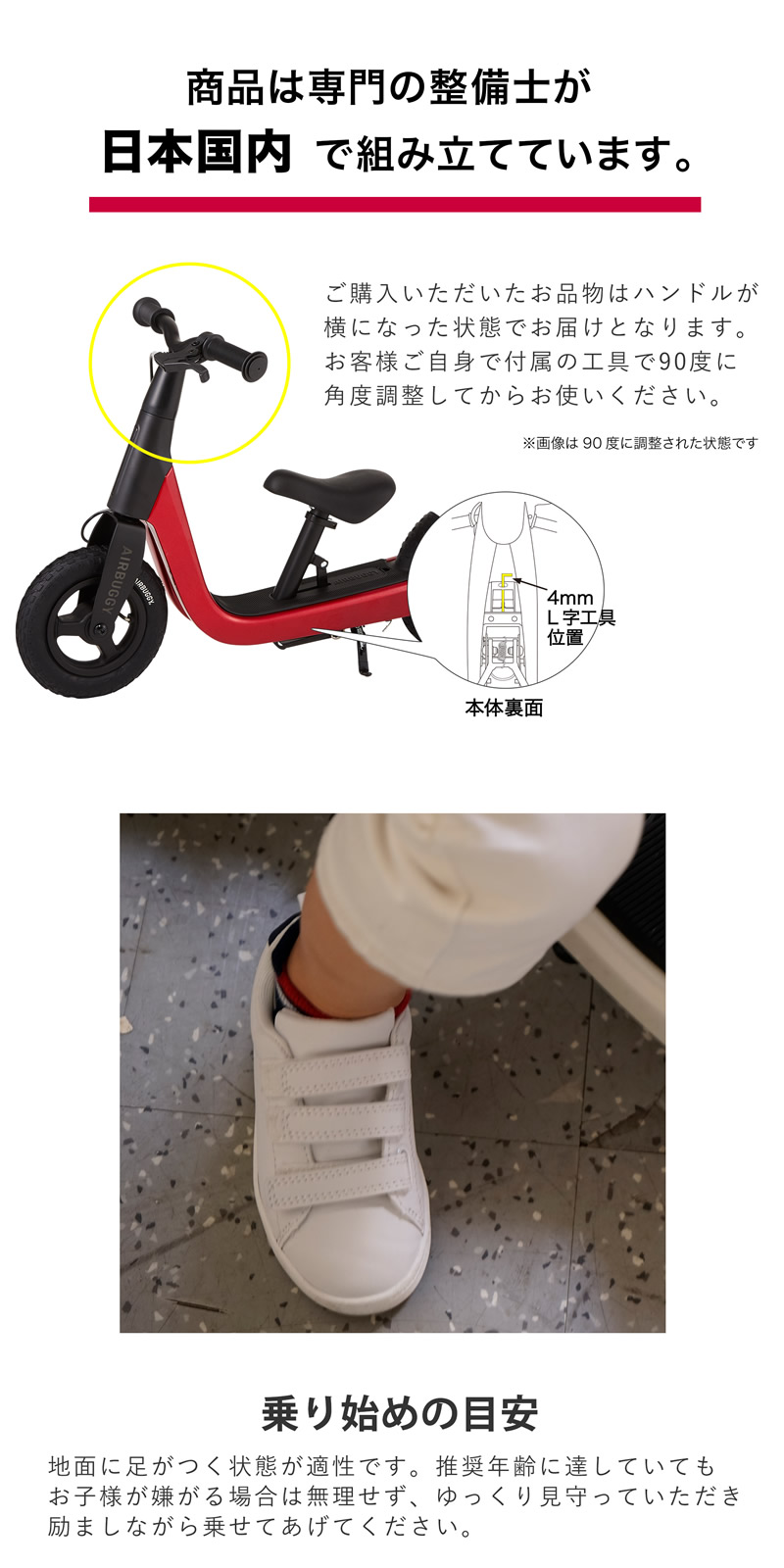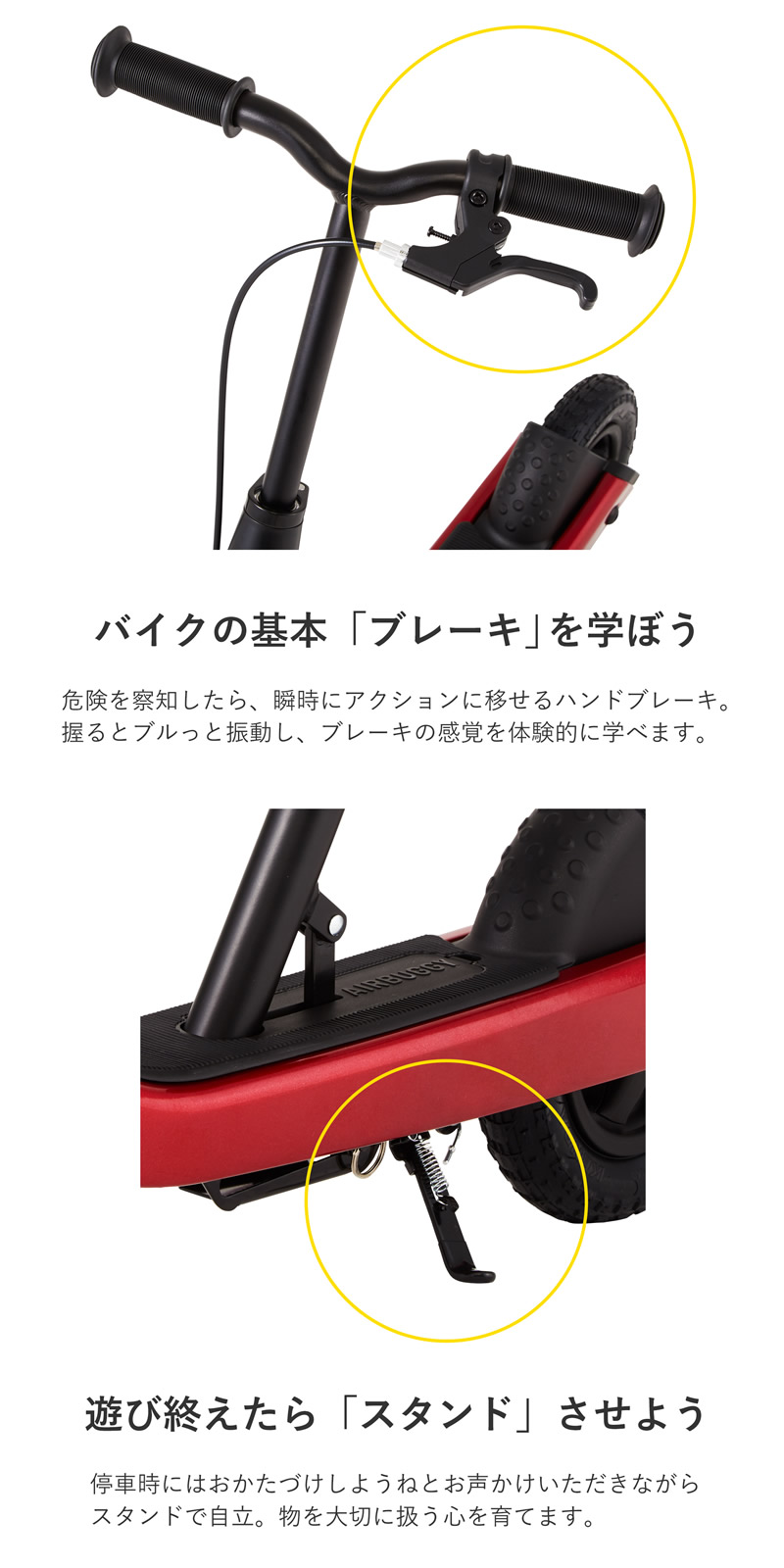 遊びながらバランス感覚を養い、ブレーキやスタンドで安全運転のルールやマナーをカラダで習得します。