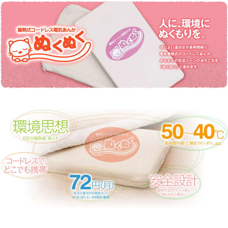 快適な保温力と安全性、さらには省エネ効果、どこでも持ち運べるコードレスの手軽さも備えた「ぬくぬく」は、きっとあなたの生活シーンでも重宝いただけると思います。