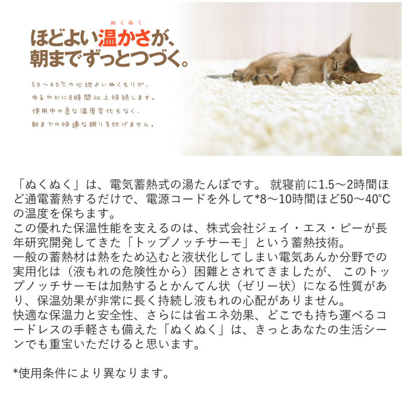 「ぬくぬく」は、電気蓄熱式の湯たんぽです。 就寝前に1.5〜2時間ほど通電蓄熱するだけで、電源コードを外して*8〜10時間ほど50〜40℃の温度を保ちます。
