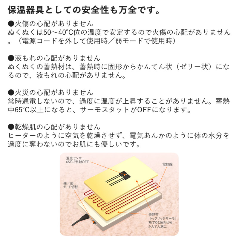 一般の蓄熱材は熱をため込むと液状化してしまい電気あんか分野での実用化は(液もれの危険性から)困難とされてきましたが、このトップノッチサーモは加熱するとかんてん状(ゼリー状)になる性質があり、保温効果が非常に長く持続し液もれの心配がありません。