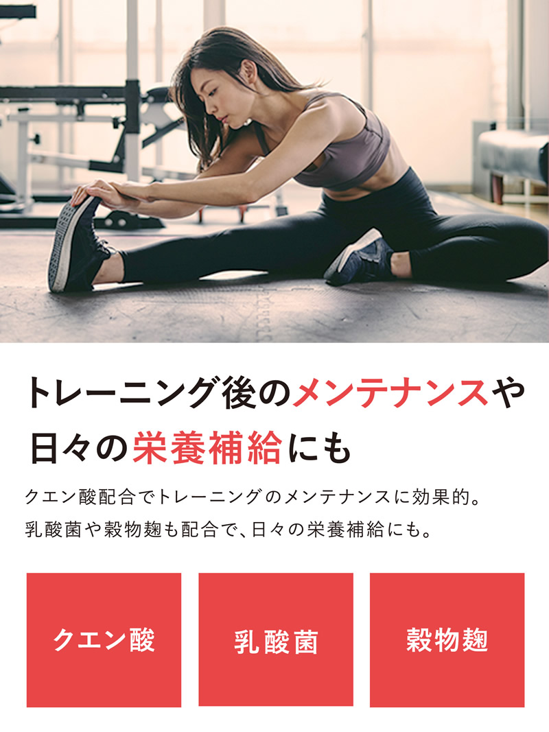 乳清タンパク(米国製造)、デキストリン、穀物麹(大麦、あわ、ひえ、きび、たかきび、紫黒米、米粉)、有胞子性乳酸菌、アセロラ末、乳酸菌凍結乾燥末/クエン酸(Na)、甘味料(ステビア、スクラロース、アセスルファムK)、乳化剤、香料、カロテノイド色素、野菜色素、(一部に乳成分・大豆を含む)