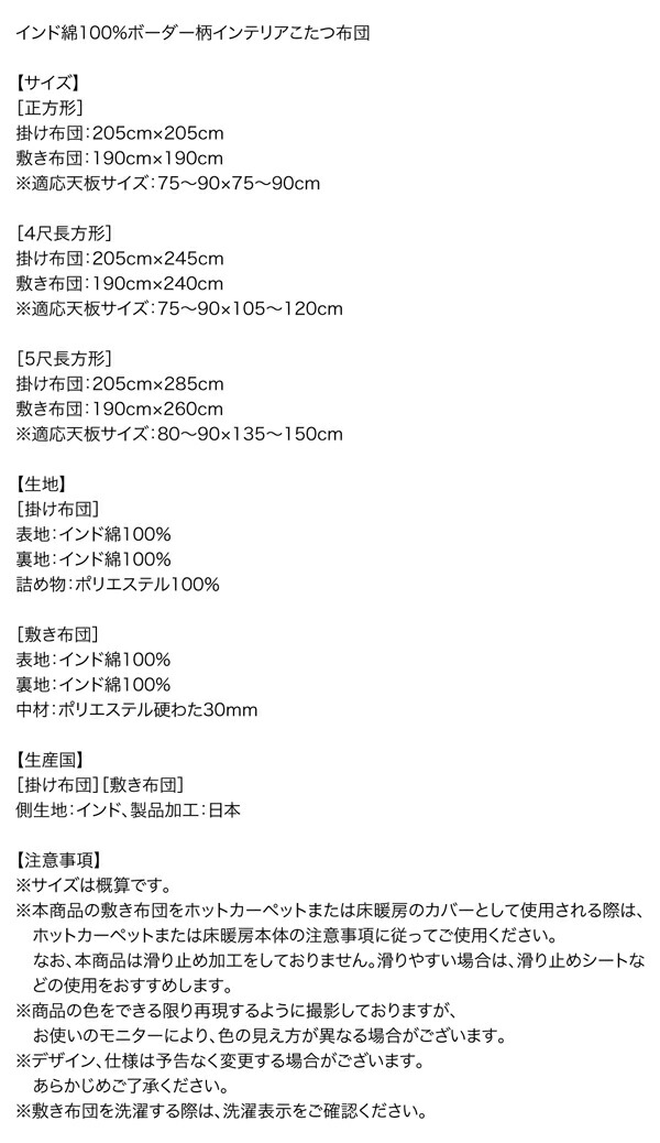 こたつ こたつ布団 おしゃれ インド綿100%ボーダーインテリアこたつ布団 こたつ用掛け布団単品 正方形(80×80cm)天板対応