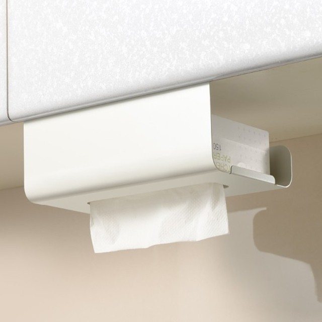 繰り返し使える粘着シートで簡単設置可能なキッチンボックスです。 作業回りに必要なのにスペースを取るキッチンペーパーボックスや保存袋の箱を戸棚下へ。 必要な時にさっと取れて、邪魔にならない優れもの。 正面にはマグネットでレシピなどのメモを貼ることもできます。