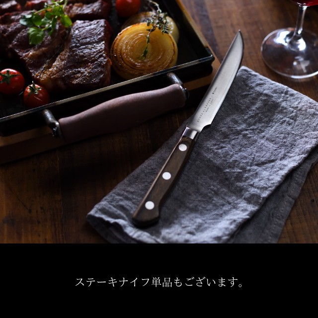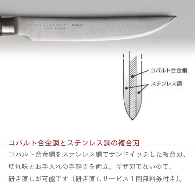 素材:ステーキナイフ/刀身/DPコバルト合金鋼複合材(心材/コバルト合金鋼、側材/ステンレス鋼(クロム13%))、口金・中子/ステンレス鋼(クロム18%、ニッケル8%)、ハンドル/積層強化木