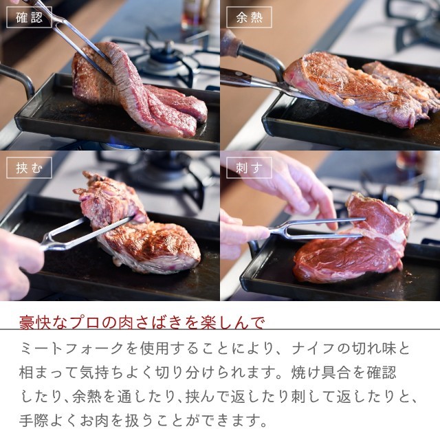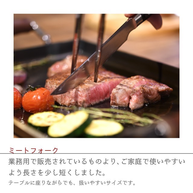size:ステーキナイフ/約全長24cm×刃渡り12cm、ミートフォーク/約全長25.7cm 刀部12cm
