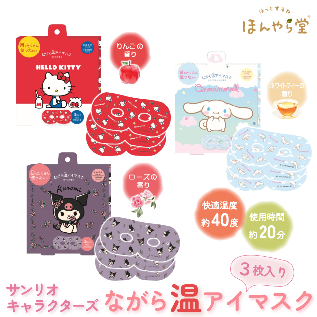 大人気のサンリオキャラクターたちが、疲れた目元を可愛く癒やす「ながら温アイマスク」になって登場! |