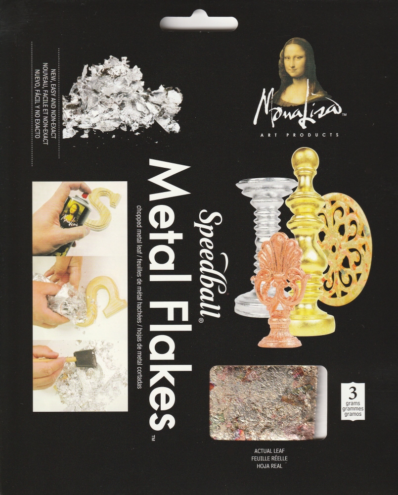 ☆メタルリーフのフレーク状(細切れ状)。濃い色の下地カラーを塗って、わざとつぎはぎに貼り付けてブラシで削ってアンティーク調に仕上ることも出来ます。