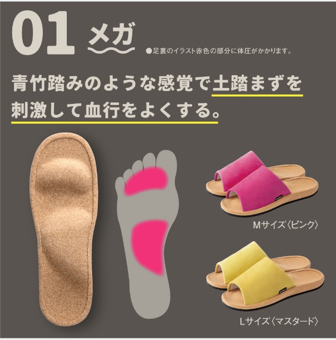 「メガ押しふみっぱ」は刺激する面積と高さのアップによって竹踏みのような感覚を得られます。