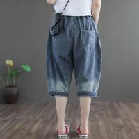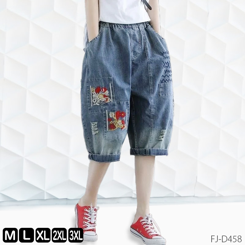 サルエル デニム 膝丈 ハーフパンツ 花柄 刺繍 腰周りゆったり スラウチ デニム ボトムス ジーンズ ジーパン 夏 ひざ丈 楽 快適 猛暑 カーブ バルーン
