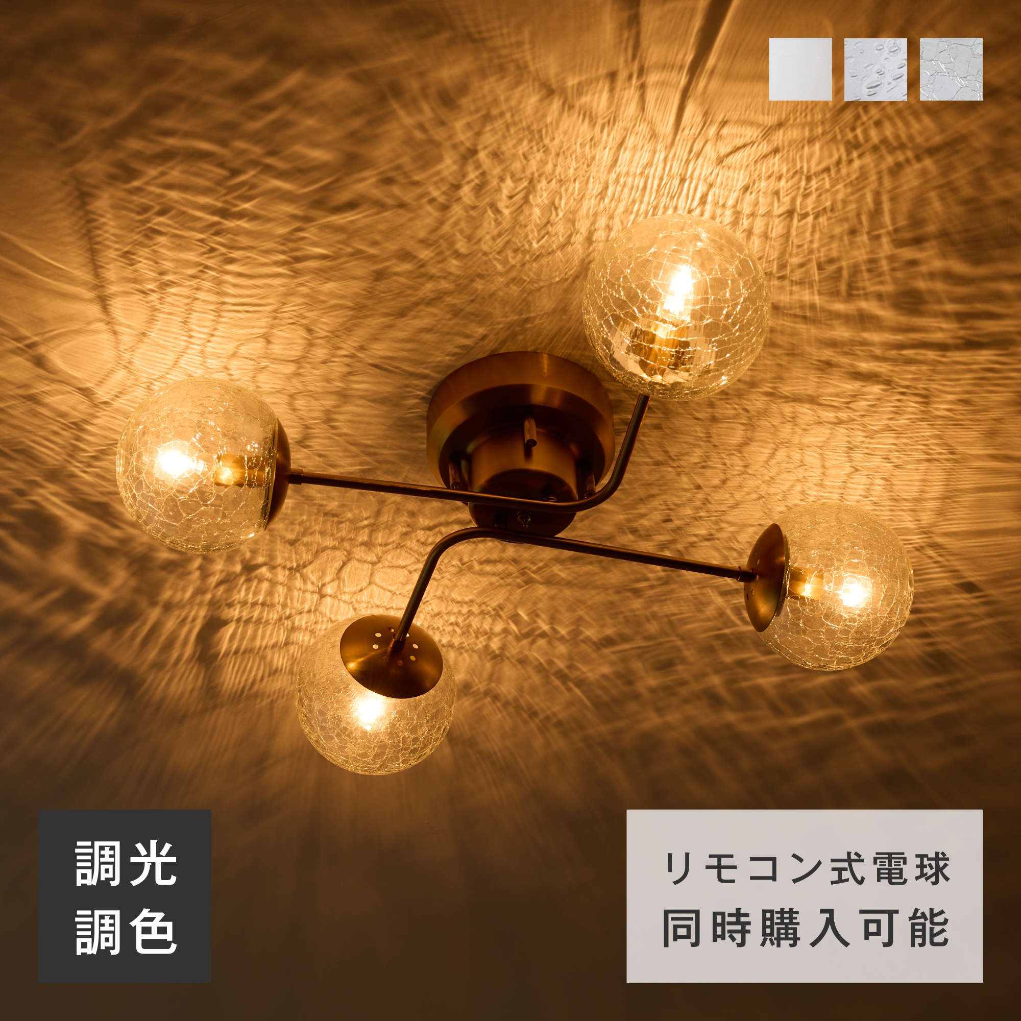 シーリングライト Modico-ART‐C(モディコ-アート-C)は毎日の暮らしをより豊かで特別なものにしたいという想いから、ゴールドフレームと美しいガラスシェードを組み合わせた洗練されたデザインを採用しました。4つの光源が織りなす上質な明るさは、リビングやダイニングを華やかに照らし出し、まるでホテルのような特別な空間を演出します。優しい丸みを帯びたフォルムが空間に柔らかな印象をもたらし、点灯時には温かな光が穏やかに広がって心地よい雰囲気を創り出します。プルチェーンスイッチによる簡単操作で2灯から全灯まで自由に切り替えでき、シーンに応じた最適な明るさでお過ごしいただけます。約330度の角度調整機能により、お好みの方向に光をコントロールし、理想的なライティング環境を実現できるよう設計しました。消灯している日中でも美しいシルエットがインテリアのアクセントとして存在感を放ち、昼夜を問わず空間を彩る照明器具として活躍します。ホワイト、バブル、クラックの3つのガラスカラーからお選びいただけ、それぞれ異なる光の表情と陰影を楽しめるため、お客様の理想とする空間づくりをサポートします。シリーズ展開により統一感のあるコーディネートも可能で、より洗練されたインテリア空間を演出していただけます。